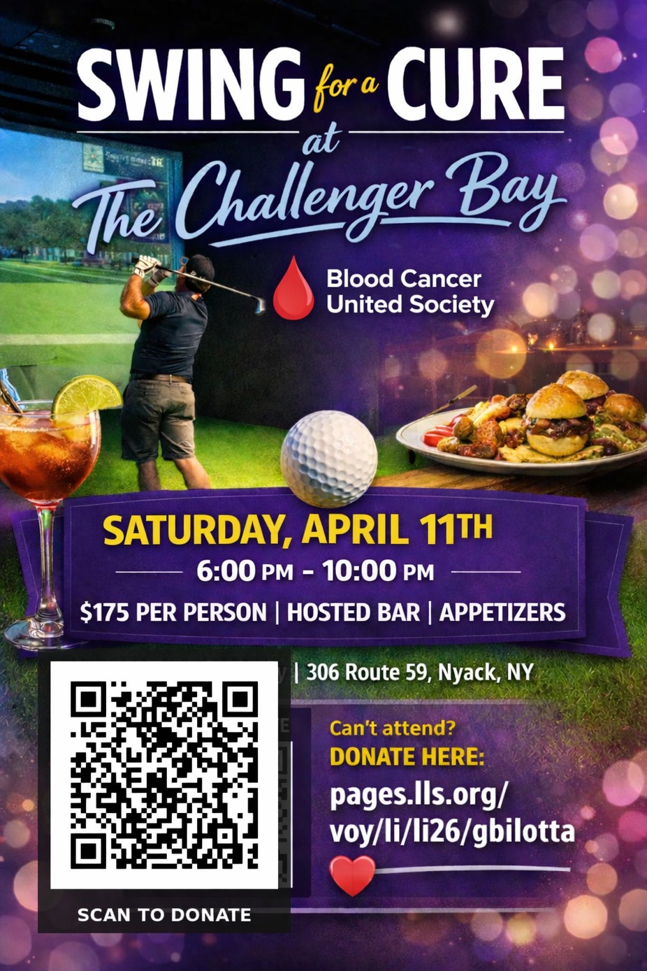 $175 per person | Hosted Bar | Appetizers • Join us for an unforgettable evening of indoor golf, great food, and even better company as The Challenger Bay hosts Swing for a Cure, a special fundraiser supporting the Blood Cancer United.